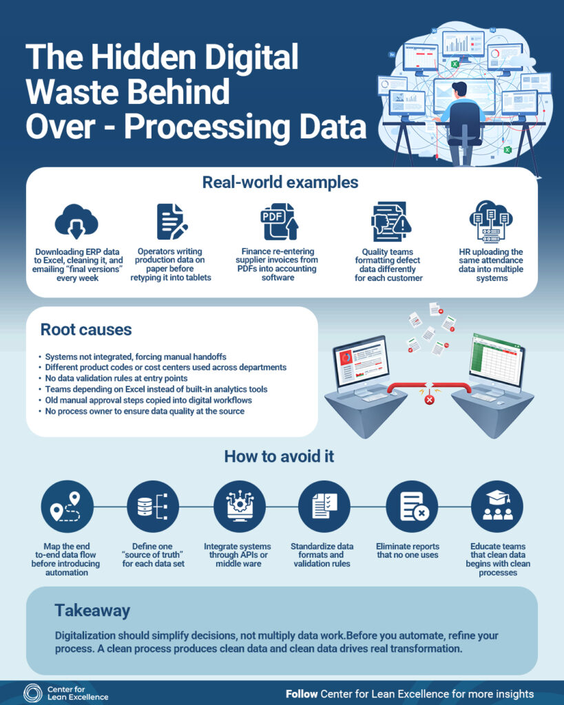 Digital over-processing happens when teams perform unnecessary digital tasks because systems are not integrated, processes are unclear, or data quality standards are missing. This hidden waste slows decision-making, increases errors and blocks true digital transformation.